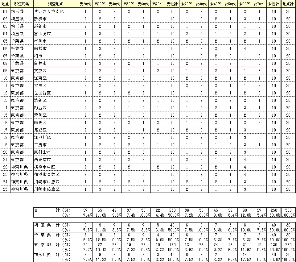 方 法:割り当て留め置き法(地点別・性年代別回収条件は下表を参照)